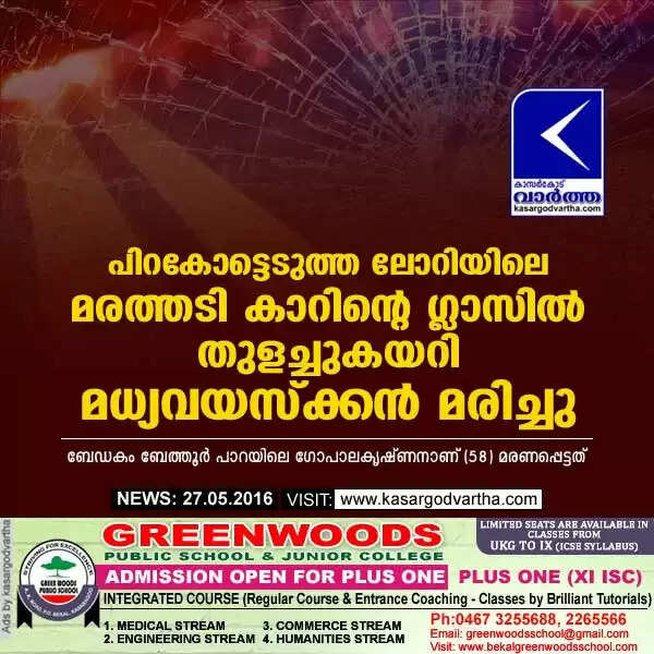 പിറകോട്ടെടുത്ത ലോറിയിലെ മരത്തടി കാറിന്റെ ഗ്ലാസില് തുളച്ചുകയറി മധ്യവയസ്ക്കന് മരിച്ചു