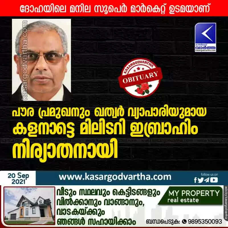 കളനാട്: (www.kasargodvartha.com 20.09.2021) പൗര പ്രമുഖനും ഖത്വർ വ്യാപാരിയുമായ കളനാട് ഫാത്വിമ പാലസിലെ മിലിടറി ഇബ്രാഹിം (70) നിര്യാതനായി.