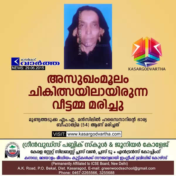 മുണ്ട്യത്തടുക്ക: (www.kasargodvartha.com 29/06/2015) അസുഖംമൂലം ചികിത്സയിലായിരുന്ന വീട്ടമ്മ മരിച്ചു. മുണ്ട്യത്തടുക്ക എം.എ. മന്സിലില് ഹസൈനാറിന്റെ ഭാര്യ ബീഫാത്വിമ (54) ആണ് മരിച്ചത്. അസുഖത്തെതുടര്ന്ന് ഒരുമാസത്തോളമായി ചികിത്സയിലായിരുന്നു.