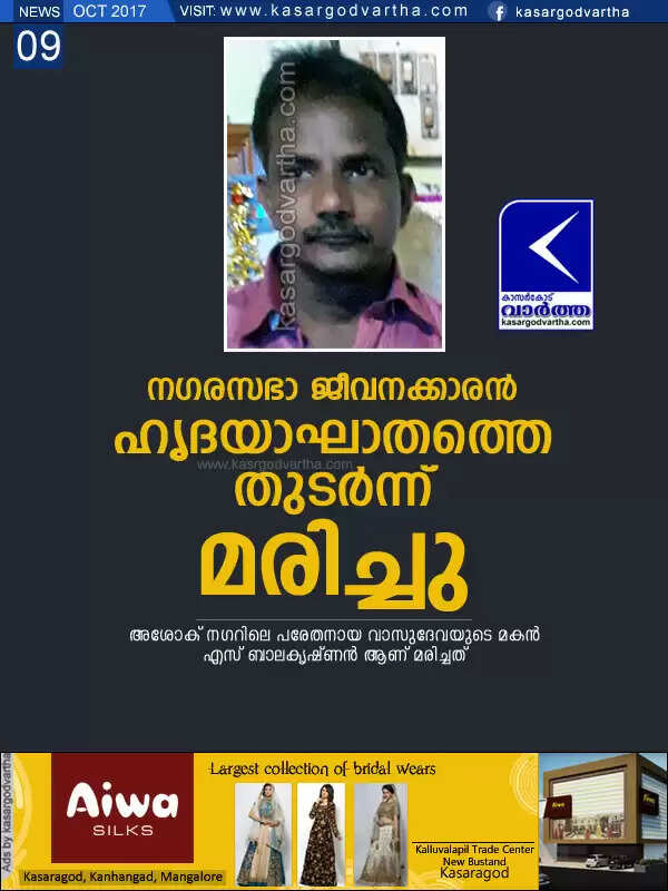 കാസര്‍കോട്: (www.kasargodvartha.com 09.10.2017) നഗരസഭാ ജീവനക്കാരന്‍ ഹൃദയാഘാതത്തെ തുടര്‍ന്ന് മരണപ്പെട്ടു. കാസര്‍കോട് നഗരസഭയിലെ ശുചീകരണ വിഭാഗം ജീവനക്കാരനും അശോക് നഗറിലെ പരേതനായ വാസുദേവയുടെ മകനുമായ എസ് ബാലകൃഷ്ണന്‍ (47) ആണ് മരിച്ചത്.