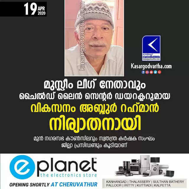 മുസ്ലീം ലീഗ് നേതാവും ചൈല്ഡ് ലൈന് സെന്റര് ഡയറക്ടറുമായ വികസനം അബ്ദുര് റഹ് മാന് നിര്യാതനായി