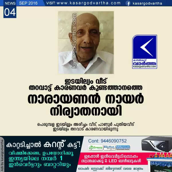 കാസര്‍കോട്: (www.kasargodvartha.com 04.09.2016) ഇടയില്യം വീട് തറവാട്ട് കാരണവര്‍ മുളിയാര്‍ പാണൂര്‍ കുണ്ടത്താനത്തെ ഇടയില്യം നാരായണന്‍ നായര്‍ (103) നിര്യാതനായി. പെരുമ്പള ഇടയില്ല്യം അരീച്ചം വീട്, പാണൂര്‍ പുതിയവീട് ഇടയില്യം തറവാട് കാരണവായിരുന്നു.