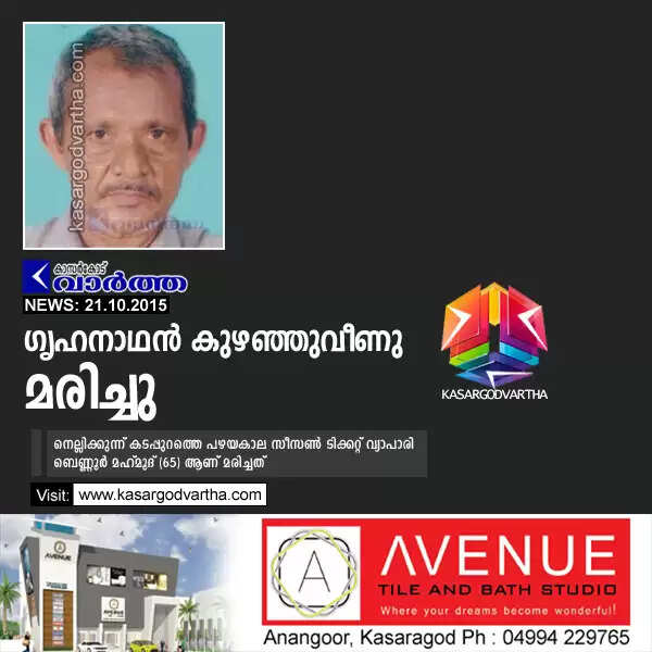 കാസര്‍കോട്: (www.kasargodvartha.com 21/10/2015) ഗൃഹനാഥന്‍ കുഴഞ്ഞുവീണു മരിച്ചു. നെല്ലിക്കുന്ന് കടപ്പുറത്തെ പഴയകാല സീസണ്‍ ടിക്കറ്റ് വ്യാപാരി ബെണ്ണൂര്‍ മഹ് മൂദ് (65) ആണ് മരിച്ചത്. ഭാര്യ ഫാത്തിമ. മക്കള്‍: സഫിയ, നസീറ, മുംതാസ്, സുബൈദ, ആസിയാബി, ഹനീഫ് (ദുബൈ), മൂസ, ലത്വീഫ് (അധ്യാപകന്‍), സര്‍ഫുന്നിസ.