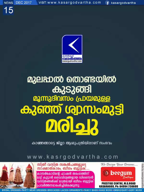Keywords: Kasaragod, Kerala, news, Kanhangad, Top-Headlines, Death, Obituary, Baby, New born baby dies after trapped milk in Throat