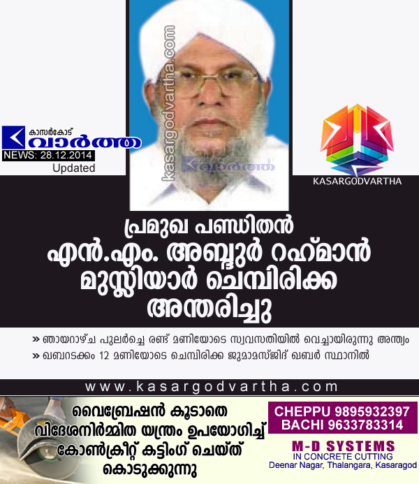 മേല്‍പറമ്പ്: (www.kasargodvartha.com 28.12.2014) സമസ്ത കേരള ജംഇയ്യത്തുല്‍ ഉലമ താലൂക്ക് മുശാവറ പ്രസിഡണ്ടും പ്രമുഖ പണ്ഡിതനുമായ ചെമ്പിരിക്കയിലെ എന്‍.എം അബ്ദുര്‍ റഹ് മാന്‍ മുസ്ലിയാര്‍ (70) അന്തരിച്ചു. ഞായറാഴ്ച പുലര്‍ച്ചെ രണ്ട് മണിയോടെ സ്വവസതിയില്‍ വെച്ചായിരുന്നു അന്ത്യം. കുറച്ചു കാലമായി അസുഖത്തെ തുടര്‍ന്ന് ചികിത്സയിലായിരുന്നു. നാലപ്പാട് തറവാട്ടിലെ പരേതരായ മമ്മുഞ്ഞി-ആസിയമ്മ ദമ്പതികളുടെ മകനാണ്.