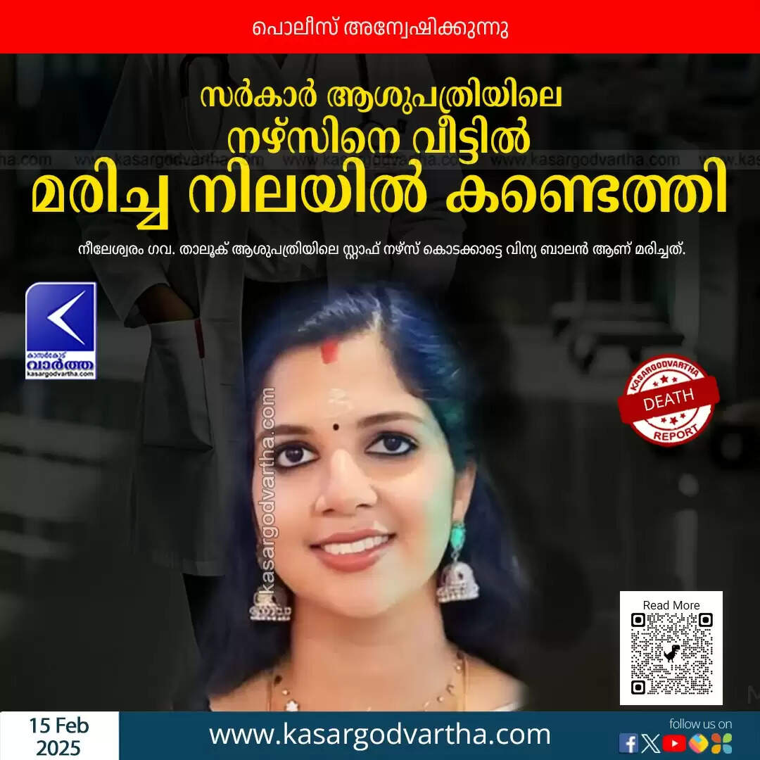 A nurse from Neeleswaram Govt. Hospital found dead at home after returning from work. The cause of death is yet to be determined, and an investigation is underway.