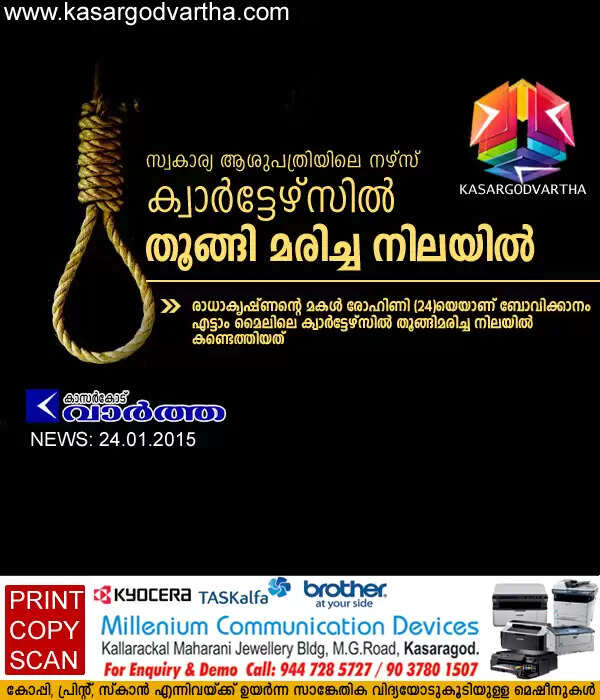 Keywords : Bovikanam, Nurse, Hospital, Death, Obituary, Kasaragod, Kerala, Police, Rohini, Nurse found dead hanged.