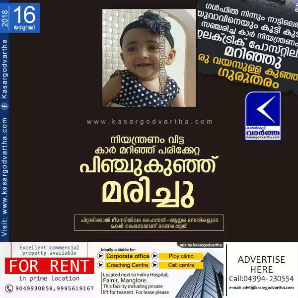 Keywords : Kasaragod, Accident, Death, Obituary, Udma, Child, News, Hospital, Treatment, Airport, Shaiba, KSTP Road.