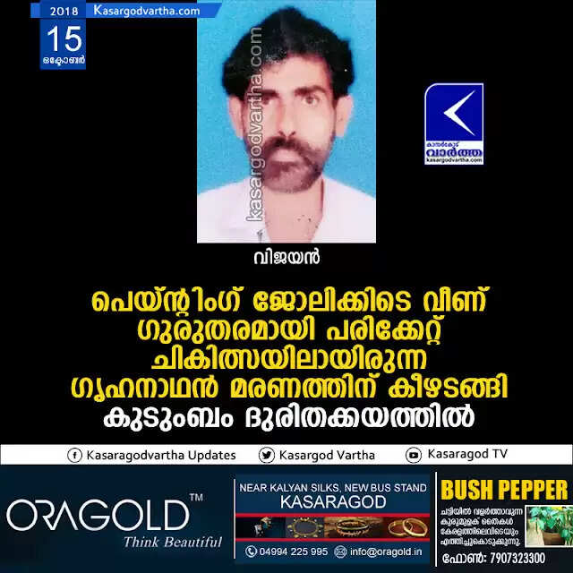 Keywords: Painting Employee died after accident injury, Kanhangad, Kasaragod, Obituary, News, Vijayan