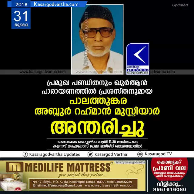 പ്രമുഖ പണ്ഡിതനും ഖുര്ആന് പാരായണത്തില് പ്രശസ്തനുമായ പാലത്തുങ്കര അബ്ദുര് റഹ് മാന് മുസ്ലിയാര് അന്തരിച്ചു