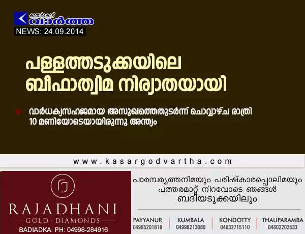 ബദിയടുക്ക: (www.kasargodvartha.com 24.09.2014) പള്ളത്തടുക്ക കടമന ഹൗസിലെ ഹസൈനാറിന്റെ ഭാര്യ ബീഫാത്വിമ (95) നിര്യാതയായി. വാര്ധക്യസഹജമായ അസുഖത്തെതുടര്ന്ന് ചൊവ്വാഴ്ച രാത്രി 10 മണിയോടെയായിരുന്നു അന്ത്യം. മാസങ്ങളോളം കിടപ്പിലായിരുന്നു.