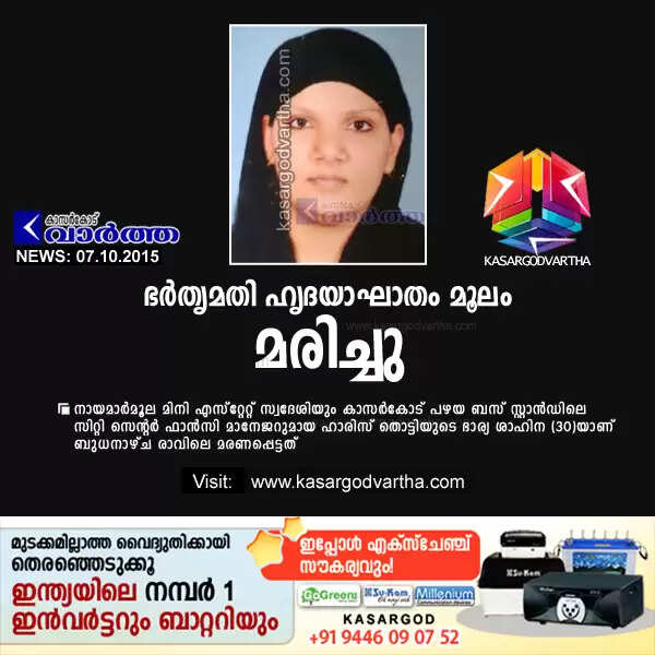 നായന്മാര്‍മൂല : (www.kasargodvartha.com 07/10/2015) ഭര്‍തൃമതി ഹൃദയാഘാതം മൂലം മരിച്ചു. നായമാര്‍മൂല മിനി എസ്‌റ്റേറ്റ് സ്വദേശിയും കാസര്‍കോട് പഴയ ബസ് സ്റ്റാന്‍ഡിലെ സിറ്റി സെന്റര്‍ ഫാന്‍സി മാനേജറുമായ ഹാരിസ് തൊട്ടിയുടെ ഭാര്യ ശാഹിന (30)യാണ് ബുധനാഴ്ച രാവിലെ മരണപ്പെട്ടത്.