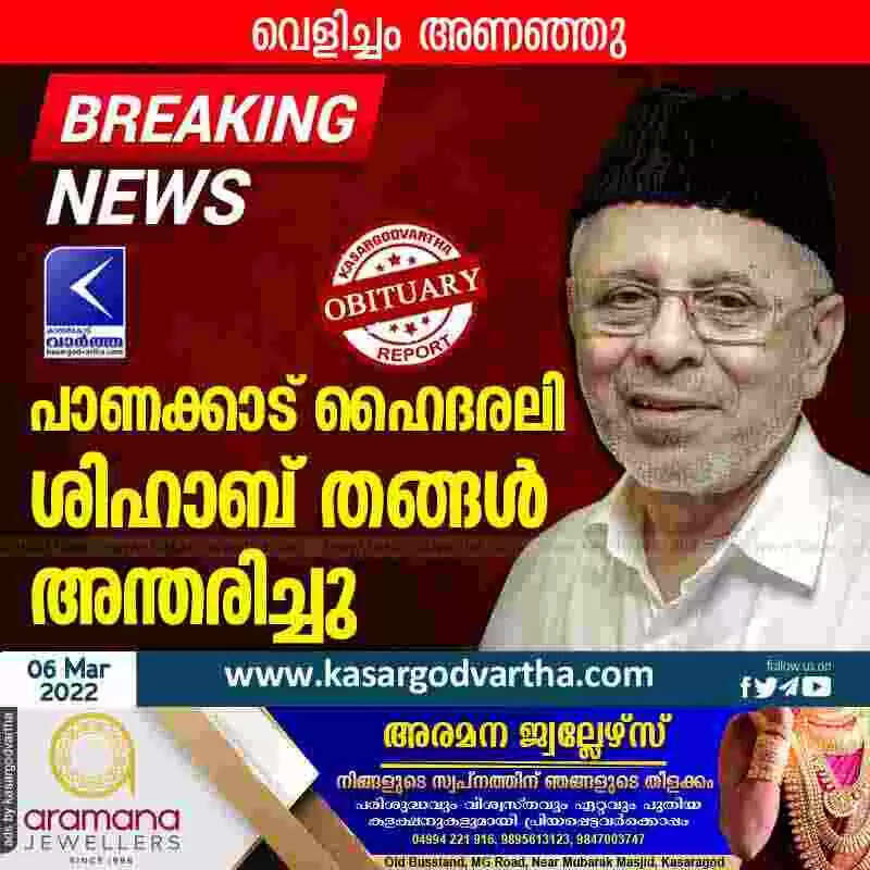 മലപ്പുറം: (www.kasargodvartha.com 06.03.2022) മുസ്ലീം ലീഗ് സംസ്ഥാന അധ്യക്ഷനും സമസ്ത കേരള ജംഇയ്യത്തുല്‍ ഉലമ സംസ്ഥാന വൈസ് പ്രസിഡന്റുമായ ഹൈദരലി ശിഹാബ് തങ്ങള്‍ (74) അന്തരിച്ചു. അസുഖബാധിതനായി ദീർഘനാളായി ചികിത്സയിലായിരുന്നു. സംസ്ഥാനത്തെ ഒട്ടേറെ മഹല്ലുകളുടെ ഖാദിയും നിരവധി സ്ഥാപങ്ങളുടെ അധ്യക്ഷനുമാണ്.