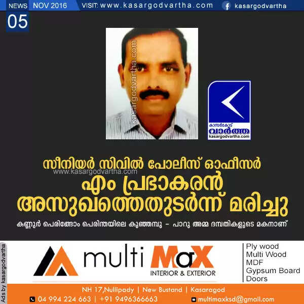 Keywords: Kasaragod, Obituary, Police, Kerala, Peringom Perinda, Peringom Perinda A Prabhakaran passes away