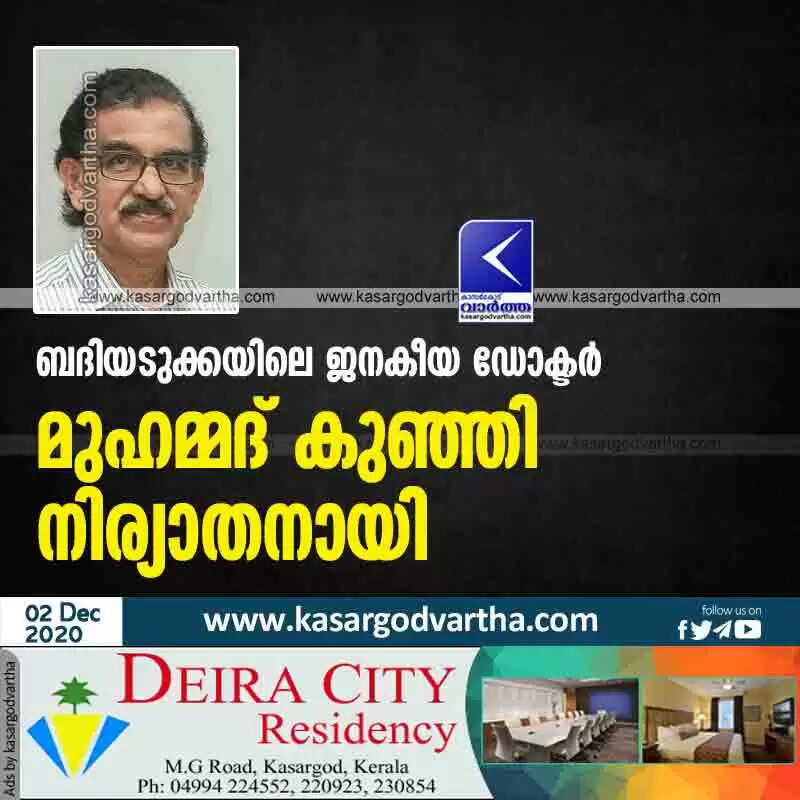 ബദിയടുക്ക: (www.kasargodvartha.com 02.12.2020) ബദിയടുക്കയിലെയും പരിസര പ്രദേശങ്ങളിലെയും ജനകീയ ഡോക്ടര് മുഹമ്മദ് കുഞ്ഞി (68) നിര്യാതനായി. കാല്നൂറ്റാണ്ടിലേറെക്കാലം ബദിയടുക്ക സി എച്ച് സിയില് സേവനം ചെയ്തിരുന്നു. മത സാമൂഹിക രംഗത്തും സുന്നീ സംഘടനാ സ്ഥാപനങ്ങളുടെ പ്രവര്ത്തനങ്ങളിലും സജീവമായിരുന്നു. ഇന്റഗ്രേറ്റഡ് പ്രൊഫഷണല്സ് ഫോറം (ഐ പി എഫ്) ബദിയടുക്ക ചാപ്റ്റര് ചെയര്മാനായിരുന്നു. പെര്ള, ബദിയടുക്ക, മുളിയാര്, കരിവെള്ളൂര് പി എച്ച് സികളില് മെഡിക്കല് ഓഫീസറായി ജോലി ചെയ്ത അദ്ദേഹം 2007 ല് കാഞ്ഞങ്ങാട്ടെ ജില്ലാ മെഡിക്കല് ഓഫീസില് നിന്നും കാസര്കോട് ജില്ലാ റീപ്രൊഡക്റ്റീവ് ആന്ഡ് ചൈല്ഡ് ഹെല്ത്ത് (ആര് സി എച്ച്) ഓഫീസറായാണ് വിരമിച്ചത്.
