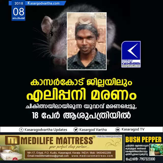 കാസര്കോട് ജില്ലയിലും എലിപ്പനി മരണം; ചികിത്സയിലായിരുന്ന യുവാവ് മരണപ്പെട്ടു, 18 പേര് ആശുപത്രിയില്