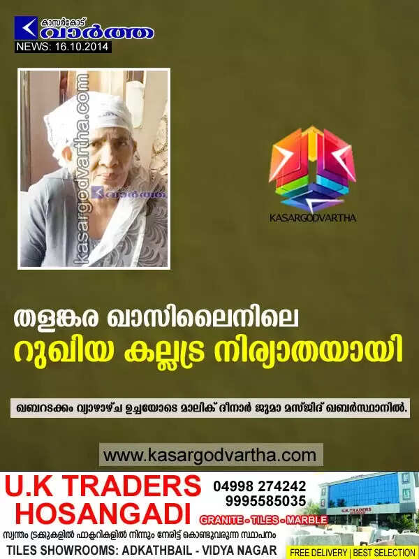 Keywords: Ruqya Kallatra passes away, Thalangara, wife, Childrens, Brothers,Sisters, Masjid, Obituary, Kerala.