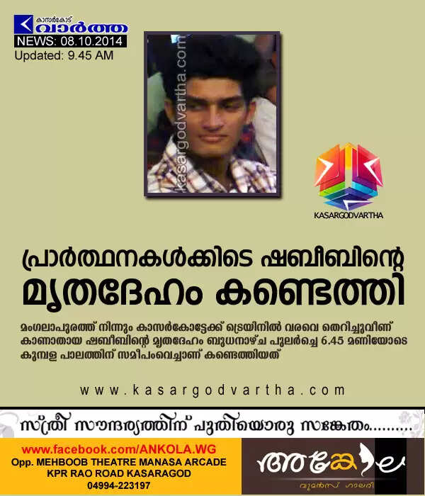 Keywords: Obituary, Missing, Train, Student, Mangalore, Kumbala, Arikady, Family, Thalangara, Shabeeb, Kasaragod, Kerala, Shabeeb's body found.