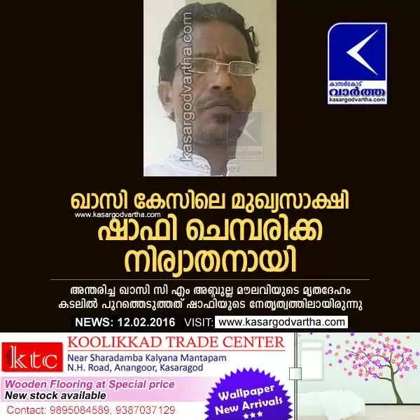 മേല്പറമ്പ: (www.kasargodvartha.com 12/02/2016) ചെമ്പരിക്ക ഖാസിയായിരുന്ന സി.എം അബ്ദുല്ല മൗലവിയുടെ ദുരൂഹ മരണ കേസിലെ മുഖ്യസാക്ഷി ഷാഫി ചെമ്പരിക്ക (48) നിര്യാതനായി. വെള്ളിയാഴ്ച വൈകിട്ട് നാല് മണിയോടെ ചെമ്പരിക്കയിലെ വീട്ടില് വെച്ചായിരുന്നു മരണം. അര്ബുദ രോഗത്തെ തുടര്ന്ന് ചികിത്സയിലായിരുന്നു.
