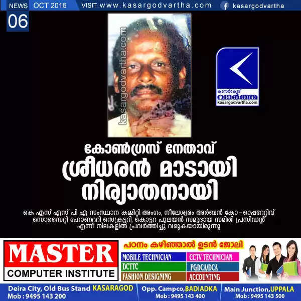 Keywords: Obituary, Neeleswaram, Congress, Dhalidh Congress, Deputy Director, Shreedharan Madayi, KSSPA, A Swameshwari.