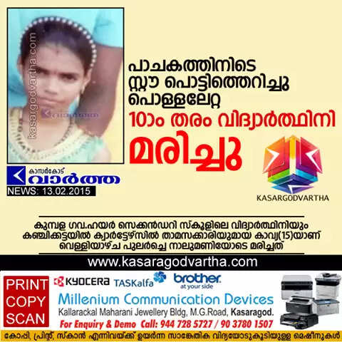 കുമ്പള: (www.kasargodvartha.com 13/02/2015) വീട്ടില് ഭക്ഷണം പാകം ചെയ്യുന്നതിനിടെ മണ്ണെണ്ണ സ്റ്റൗ പൊട്ടിത്തെറിച്ച് ഗുരുതരമായി പൊള്ളലേറ്റ് മംഗളൂരുവിലെ ആശുപത്രിയില് ചികിത്സയിലായിരുന്ന പത്താം തരം വിദ്യാര്ത്ഥിനി മരിച്ചു. കുമ്പള ഗവ.ഹയര് സെക്കന്ഡറി സ്കൂളിലെ വിദ്യാര്ത്ഥിനിയും കഞ്ചിക്കട്ടയില് ക്വാര്ട്ടേഴ്സില് താമസക്കാരിയുമായ കാവ്യ(15)യാണ് വെള്ളിയാഴ്ച പുലര്ച്ചെ നാലുമണിയോടെ മരിച്ചത്.