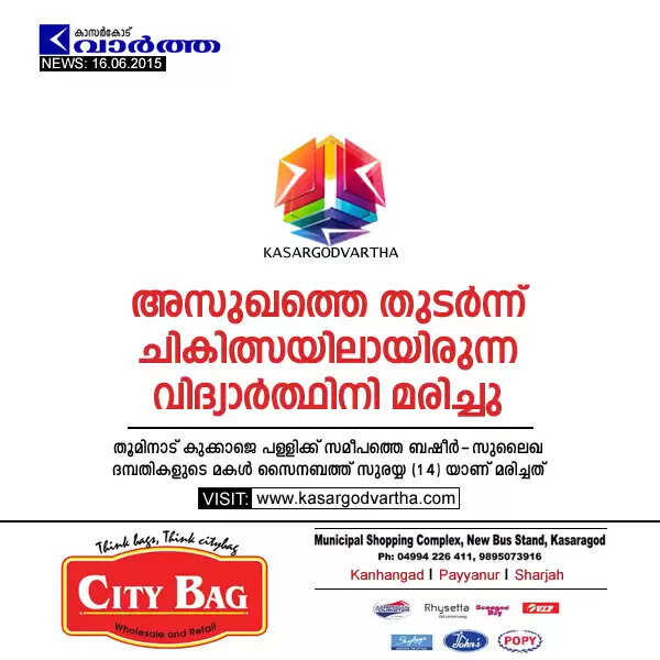 മഞ്ചേശ്വരം: (www.kasargodvartha.com 16/06/2015) അസുഖം മൂലം ചികിത്സയിലായിരുന്ന വിദ്യാര്‍ത്ഥിനി മരിച്ചു. തൂമിനാട് കുക്കാജെ പള്ളിക്ക് സമീപത്തെ ബഷീര്‍-സുലൈഖ ദമ്പതികളുടെ മകള്‍ സൈനബത്ത് സുരയ്യ (14)യാണ് മരിച്ചത്. കുഞ്ചത്തൂര്‍ ഗവ. ഹയര്‍ സെക്കന്‍ഡറി സ്‌കൂളിലെ ഒമ്പതാം ക്ലാസ് വിദ്യാര്‍ത്ഥിനിയായ സുരയ്യ ഒരുവര്‍ഷത്തോളമായി വിവിധ ആശുപത്രികളിലായി ചികിത്സയിലായിരുന്നു.
