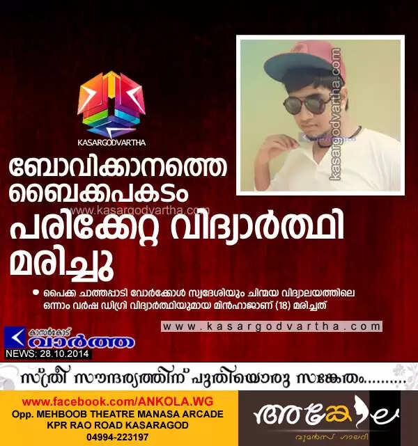 ബോവിക്കാനം: (www.kasargodvartha.com 28.10.2014) ഒക്ടോബര് 21ന് ബോവിക്കാനം ടൗണിലുണ്ടായ ബൈക്കപകടത്തില് ഗുരുതരമായി പരിക്കേറ്റ് ആശുപത്രിയില് കഴിയുകയായിരുന്ന കോളജ് വിദ്യാര്ത്ഥി മരിച്ചു. പൈക്ക ചാത്തപ്പാടി വോര്ക്കോള് സ്വദേശിയും വിദ്യാനഗര് ചിന്മയ വിദ്യാലയത്തിലെ ഒന്നാം വര്ഷ ഡിഗ്രി വിദ്യാര്ത്ഥിയുമായ മിന്ഹാജാണ് (18) മരിച്ചത്.