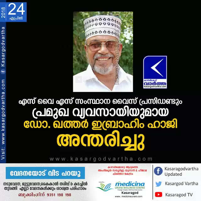 എസ് വൈ എസ് സംസ്ഥാന വൈസ് പ്രസിഡണ്ടും പ്രമുഖ വ്യവസായിയുമായ ഡോ. ഖത്തര് ഇബ്രാഹിം ഹാജി അന്തരിച്ചു