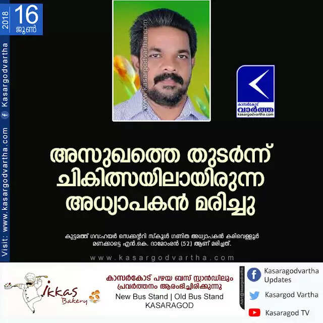 ചെറുവത്തൂര്:(www.kasargodvartha.com 16/06/2018) അസുഖത്തെ തുടര്ന്ന് ചികിത്സയിലായിരുന്ന അധ്യാപകന് മരിച്ചു. കുട്ടമത്ത് ഗവ:ഹയര് സെക്കന്ററി സ്കൂള് ഗണിത അധ്യാപകന് കരിവെള്ളൂര് മണക്കാട്ടെ എന്.കെ. ദാമോംരന് (52) ആണ് മരിച്ചത്. തലശ്ശേരി കാന്സര് സെന്ററില് ശനിയാഴ്ച പുലര്ച്ചെ നാല് മണിയോടെയായിരുന്നു അന്ത്യം. ആറ് മാസത്തോ ളമായി അസുഖബാധിതനായി ചികിത്സ നടത്തിവരികയായിരുന്നു. മൃതദേഹം രാവിലെ 9.കുട്ടമത്ത് ഹൈസ്ക്കൂളില് പൊതുദര്ശനത്തിനു വെച്ച ശേഷം വീട്ടിലേക്ക് കൊണ്ടുപോയി.
