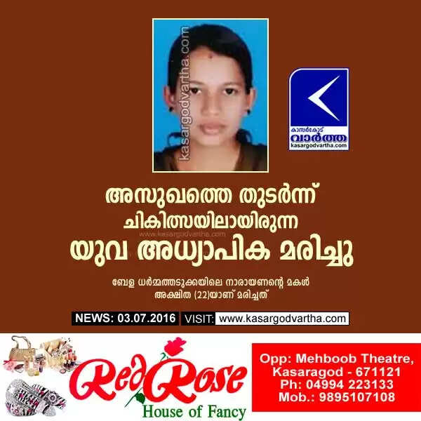കുമ്പള: (www.kasargodvartha.com 03/07/2016) അസുഖത്തെ തുടര്ന്ന് ചികിത്സയിലായിരുന്ന യുവ അധ്യാപിക മരിച്ചു. ബേള ധര്മ്മത്തടുക്കയിലെ നാരായണന്റെ മകള് അക്ഷിത (22)യാണ് മരിച്ചത്. നായിക്കാപ്പ് മുജങ്കാവിലെ ഭാരതി വിദ്യാപീഠത്തിലെ അധ്യാപികയാണ്. മൂന്നു മാസം മുമ്പാണ് മസ്തിഷ്ക്ക രോഗത്തെ തുടര്ന്ന് മംഗളൂരുവിലെ ആശുപത്രിയില് പ്രവേശിപ്പിച്ചത്.