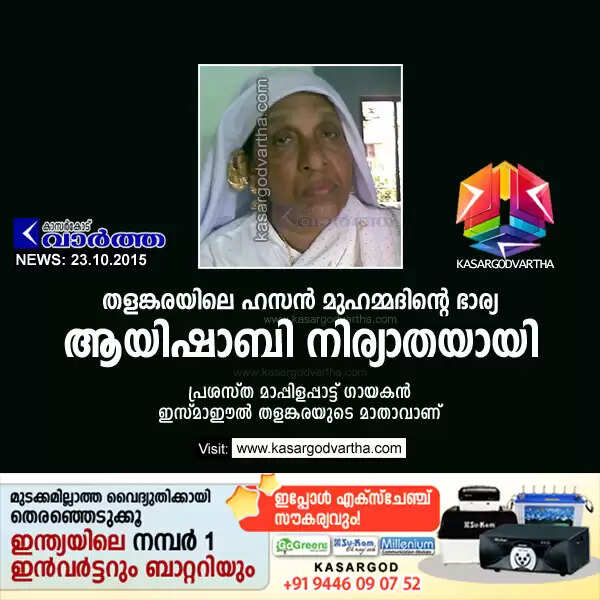 കാസര്കോട്: (www.kasargodvartha.com 23/10/2015) പ്രശസ്ത മാപ്പിളപ്പാട്ട് ഗായകന് ഇസ്മാഈല് തളങ്കരയുടെ മാതാവും തളങ്കര ഖാസിലേന് റിസാ മന്സിലില് പരേതനായ ഹസന് മുഹമ്മദിന്റെ ഭാര്യയുമായ ആയിഷാബി(67) നിര്യാതയായി. മുഹമ്മദ് ബഷീര്, പി എച്ച് ഖാദര് (മുംബൈ), ഇബ്രാഹിം കറാമ, ഇസ്ഹാഖ്, സഫൂറ, സഫീന എന്നിവരാണ് മറ്റുമക്കള്.