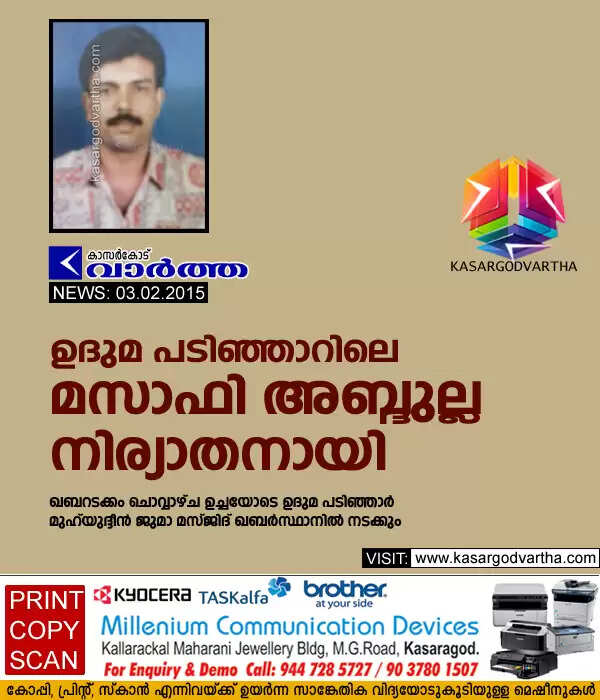 ഉദുമ: (www.kasargodvartha.com 03/02/2015) ഉദുമ പടിഞ്ഞാറിലെ മസാഫി അബ്ദുല്ല(52) നിര്യാതനായി. മുഹമ്മദ് കുഞ്ഞി ഹാജി-നഫീസ ദമ്പതികളുടെ മകനാണ്.