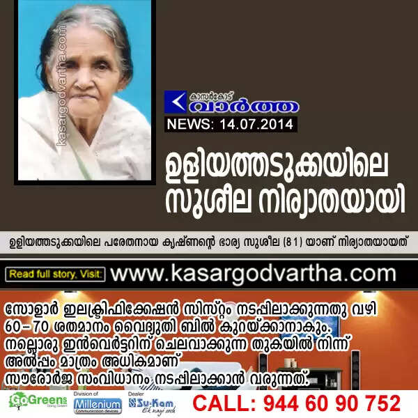 Keywords: Uliyathaduka, Obituary, Kasaragod, Kerala, Uliyathaduka Susheela passes away.