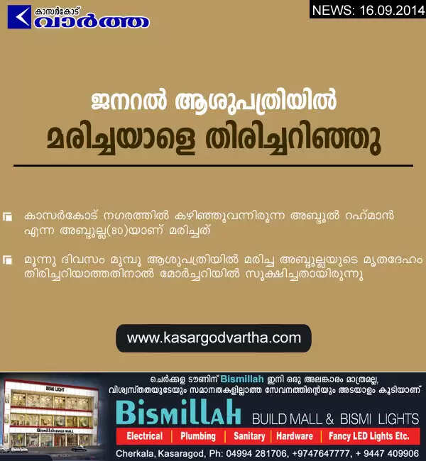 കാസര്‍കോട്: (www.kasargodvartha.com 16.09.2014) ജനറല്‍ ആശുപത്രിയില്‍ മരണപ്പെട്ടയാളുടെ മോര്‍ച്ചറിയില്‍ സൂക്ഷിച്ചിരുന്ന മൃതദേഹം തിരിച്ചറിഞ്ഞു. കാസര്‍കോട് നഗരത്തില്‍ കഴിഞ്ഞുവന്നിരുന്ന അബ്ദുല്‍ റഹ് മാന്‍ എന്ന അബ്ദുല്ല(80)യാണ് മരിച്ചത്.