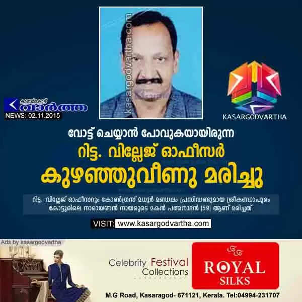 വോട്ട് ചെയ്യാന് പോവുകയായിരുന്ന റിട്ട. വില്ലേജ് ഓഫീസര് കുഴഞ്ഞുവീണു മരിച്ചു