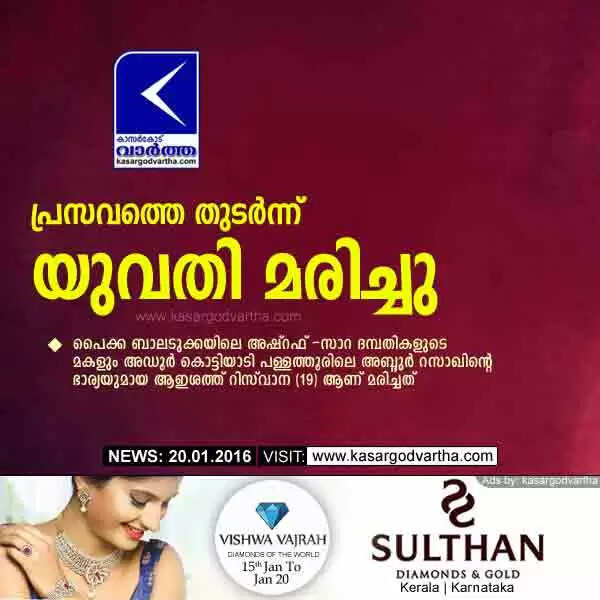 പൈക്ക: (www.kasargodvartha.com 20/01/2016) പ്രസവത്തെ തുടര്ന്ന് യുവതി മരിച്ചു. പൈക്ക ബാലടുക്കയിലെ അഷ്റഫ് - സാറ ദമ്പതികളുടെ മകളും അഡൂര് കൊട്ടിയാടി