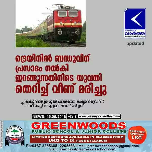 ട്രെയിനില് ബന്ധുവിന് പ്രസാദം നല്കി ഇറങ്ങുന്നതിനിടെ യുവതി തെറിച്ച് വീണ് മരിച്ചു