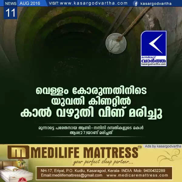 വിവരമറിഞ്ഞ് കുറ്റിക്കോലില് നിന്നും ഫയര്ഫോഴ്സെത്തി ആശയെ കിണറില് നിന്ന് പുറത്തെടുത്തെങ്കിലും മരണം സംഭവിച്ചിരുന്നു. അവിവാഹിതയാണ് മരണപ്പെട്ട ആശ. രണ്ട് സഹോദരിമാരുണ്ട്. ബേഡകം പോലീസ് ഇന്ക്വസ്റ്റ് നടത്തിയ മൃതദേഹം പോസ്റ്റുമോര്ട്ടത്തിനായി കാസര്കോട് ജനറല് ആശുപത്രി മോര്ച്ചറിയിലേക്ക് മാറ്റി.
