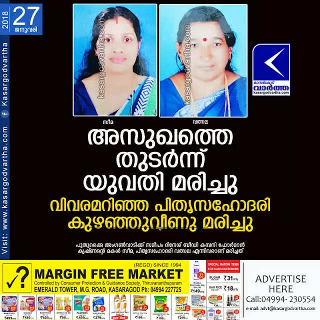 പടന്നക്കാട്: (www.kasargodvartha.com 27.01.2018) അസുഖത്തെ തുടര്ന്ന് ചികിത്സയിലായിരുന്ന യുവതി മരിച്ചു. വിവരമറിഞ്ഞ പിതൃസഹോദരി കുഴഞ്ഞുവീണു മരിച്ചു. പുതുക്കൈ അംഗണ്വാടിക്ക് സമീപം ദിനേശ് ബീഡി കമ്പനി ഫോര്മാന് കൃഷ്ണന്റെ മകള് സീമ (36) യാണ് അസുഖത്തെ തുടര്ന്ന് മരണപ്പെട്ടത്. കാന്സര് ബാധയെ തുടര്ന്ന് ചികിത്സയിലായിരുന്നു. കഴിഞ്ഞ ദിവസം തോയമ്മല് ജില്ലാ ആശുപത്രിയില് വെച്ചായിരുന്നു അന്ത്യം.