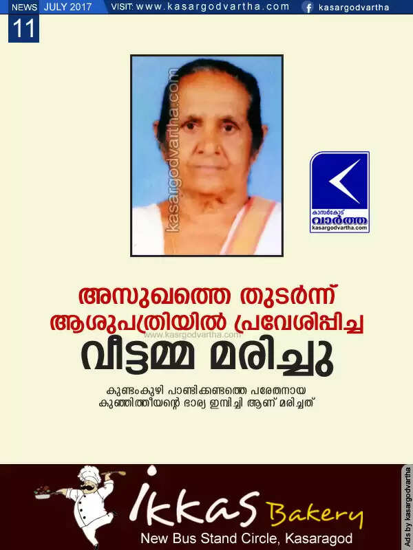 കാസര്‍കോട്: (www.kasargodvartha.com 11.07.2017) ഛര്‍ദി അതിസാരത്തെ തുടര്‍ന്ന് ആശുപത്രിയില്‍ പ്രവേശിപ്പിച്ച വീട്ടമ്മ മരിച്ചു. കുണ്ടംകുഴി പാണ്ടിക്കണ്ടത്തെ പരേതനായ കുഞ്ഞിത്തീയന്റെ ഭാര്യ ഇമ്പിച്ചി (80) ആണ് മരിച്ചത്. രണ്ട് ദിവസം മുമ്പാണ് ഇവരെ ഛര്‍ദിയും വയറിളക്കവും പനിയും ബാധിച്ചതിനെ തുടര്‍ന്ന് കാസര്‍കോട് ജനറല്‍ ആശുപത്രിയില്‍ പ്രവേശിപ്പിച്ചത്.