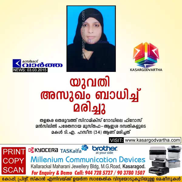 കാസര്‍കോട്: (www.kasargodvartha.com 03/03/2015) യുവതി അസുഖം ബാധിച്ച് മരിച്ചു. തളങ്കര തെരുവത്ത് സിറാമിക്‌സ് റോഡിലെ ഫിറോസ് മന്‍സിലില്‍ പരേതനായ മുസ്തഫ-ആഇശ ദമ്പതികളുടെ മകള്‍ ടി.എ. ഹസീന (34) ആണ് മരിച്ചത്.