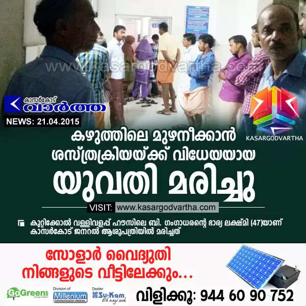 Keywords : Kasaragod, Kerala, General-hospital, Death, Obituary, Husband, Lakshmi, Woman dies after surgery.