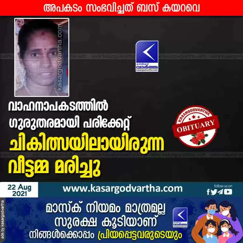 Keywords: Kasaragod, Kerala, News, Bandaduka, Vehicle, Accident, Obituary, Death, Treatment, Bus, Kanhangad, District-Hospital, Kozhikode, Top-Headlines, Woman, who was undergoing treatment for serious injuries in accident, died.
