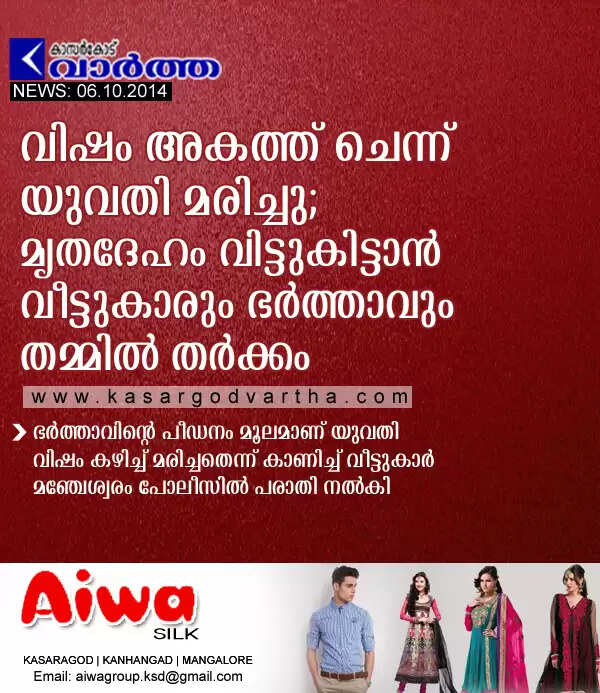 വിഷം അകത്ത് ചെന്ന് യുവതി മരിച്ചു; മൃതദേഹം വിട്ടുകിട്ടാന് വീട്ടുകാരും ഭര്ത്താവും തമ്മില് തര്ക്കം