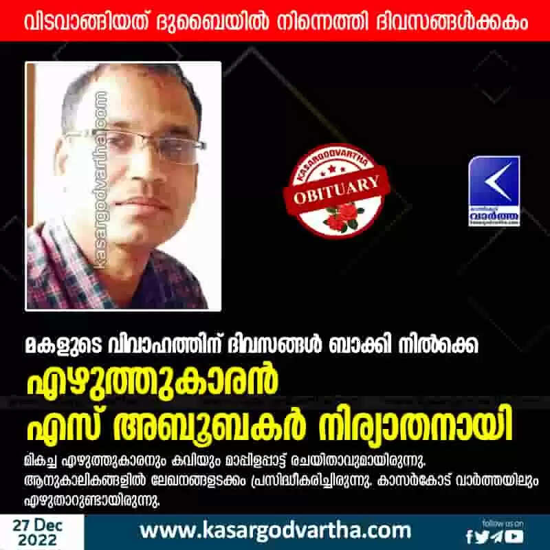 പട്ല : (www.kasargodvartha.com) മകളുടെ വിവാഹത്തിന് ദിവസങ്ങൾ ബാക്കി നിൽക്കെ എഴുത്തുകാരൻ പട് ലയിലെ എസ് അബൂബകർ (53) നിര്യാതനായി. ദുബൈയിൽ ജോലി ചെയ്തിരുന്ന അബൂബകർ ദിവസങ്ങൾക്ക് മുമ്പാണ് നാട്ടിലെത്തിയത്. ജനുവരി അഞ്ചിനാണ് മകളുടെ വിവാഹം നിശ്ചയിച്ചിരുന്നത്. അതിന്റെ ഒരുക്കൾങ്ങൾക്കിടെയാണ് വിടവാങ്ങിയത്.