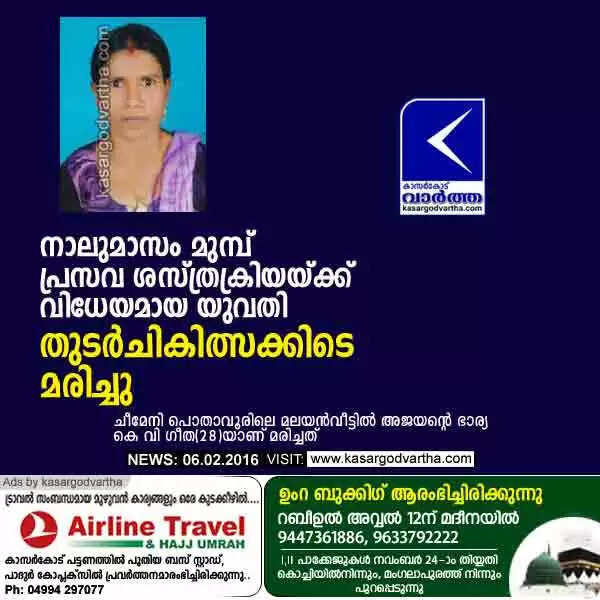 കാഞ്ഞങ്ങാട്: (www.kasargodvartha.com 06.02.2016) നാലുമാസം മുമ്പ് പ്രസവ ശസ്ത്രക്രിയയ്ക്ക് വിധേയമായ യുവതി തുടര്‍ ചികിത്സക്കിടെ മരണപ്പെട്ടു. ചീമേനിക്കടുത്ത് പൊതാവൂരിലെ മലയന്‍വീട്ടില്‍ അജയന്റെ ഭാര്യ കെ.വി. ഗീത(28)യാണ് മരണപ്പെട്ടത്. മലപ്പുറം ചീയന്നൂര്‍ സ്വദേശിനിയാണ്.
