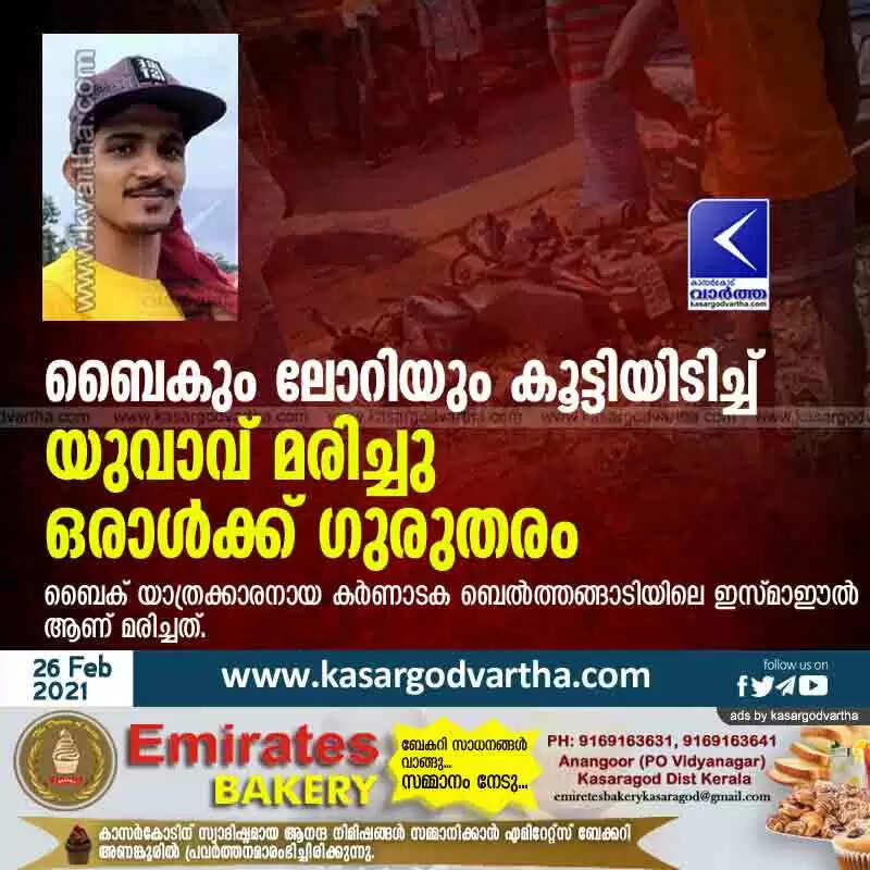 ബണ്ട് വാൾ: (www.kasargodvartha.com 26.02.2021) ബൈകും ലോറിയും കൂട്ടിയിടിച്ച് യുവാവ് മരിച്ചു. ഒരാൾക്ക് ഗുരുതരമായി പരിക്കേറ്റു. ബൈക് യാത്രക്കാരനായ ബെൽത്തങ്ങാടിയിലെ ഇസ്മാഈൽ (22) ആണ് മരിച്ചത്. കൂടെയുണ്ടായിരുന്ന സുഹൃത്ത് ബെൽത്തങ്ങാടി അലാകെ സ്വദേശി അബ്ബാസിനെ (22) പരിക്കുകളോടെ മംഗളൂരുവിലെ ആശുപത്രിയിൽ പ്രവേശിപ്പിച്ചു.