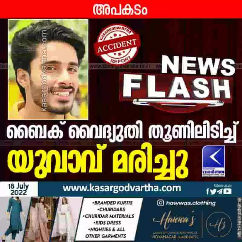Keywords: News, Short-News, Kerala, Kasaragod, Top-Headlines, Accident, Accidental-Death, Bike-Accident, Died, Dead, Police, Tragedy, Obituary, Young man died after bike hit an electricity pole. < !- START disable copy paste -->