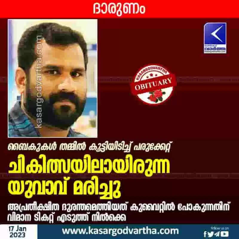 Died | ബൈകുകള് തമ്മില് കൂട്ടിയിടിച്ച് പരുക്കേറ്റ് ചികിത്സയിലായിരുന്ന യുവാവ് മരിച്ചു; അപ്രതീക്ഷിത ദുരന്തമെത്തിയത് കുവൈറ്റില് പോകുന്നതിന് വിമാന ടികറ്റ് എടുത്ത് നില്ക്കെ