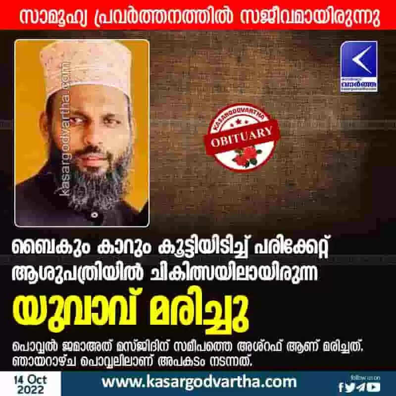 മുളിയാര്‍: (www.kasargodvartha.com) ബൈകും കാറും കൂട്ടിയിടിച്ച് പരിക്കേറ്റ് മംഗ്‌ളൂറിലെ ആശുപത്രിയില്‍ ചികിത്സയിലായിരുന്ന യുവാവ് മരിച്ചു. പൊവ്വല്‍ ജമാഅത് മസ്ജിദിന് സമീപത്തെ അശ്റഫ് (37) ആണ് മരിച്ചത്. ഞായറാഴ്ച പൊവ്വലില്‍ നബിദിന പരിപാടിക്കിടെയായിരുന്നു അപകടം.